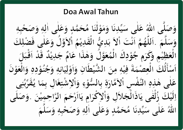 Artinya, “Tuhanku, Kau yang Abadi, Qadim, dan Awal. Atas karunia-Mu yang besar dan kemurahan-Mu yang mulia, Kau menjadi pintu harapan. Tahun baru ini sudah tiba. Aku berlindung kepada-Mu dari bujukan Iblis dan para walinya di tahun ini. Aku pun mengharap pertolongan-Mu dalam mengatasi nafsu yang kerap mendorongku berlaku jahat. Kepada-Mu, aku memohon bimbingan agar aktivitas keseharian mendekatkanku pada rahmat-Mu. Wahai Tuhan Pemilik Kebesaran dan Kemuliaan.”